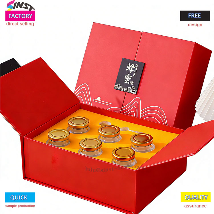 یہ سرخ شہد کے تحفے والے خانے میں خوبصورت لہر کے نمونوں کو اعلی معیار کے سخت گتے کے ساتھ جوڑ دیا گیا ہے ، جس میں اسٹوریج اور ٹرانسپورٹیشن کے لئے آسانی سے فولڈیبل ڈھانچہ شامل ہے۔ ہنی گفٹ باکس مختلف قسم کے شیشے کے جار سائز (شہد/ٹانک کے لئے) کی حمایت کرتا ہے اور مندرجات کو روکنے کے لئے ایک کسٹم فوم داخل کے ساتھ آتا ہے۔ یورپی ، امریکی ، اور جنوب مشرقی ایشیائی منڈیوں میں تحفے کی ترجیحات کے مطابق ، چھٹی کے تحائف ، کاروباری تحائف ، اور صحت کی مصنوعات کی پیکیجنگ کے لئے بہت موزوں ہے۔ یہ باکس ہلکا پھلکا ، سجیلا اور سرمایہ کاری مؤثر ہے جبکہ مصنوعات کی قیمت میں اضافہ ہوتا ہے۔
